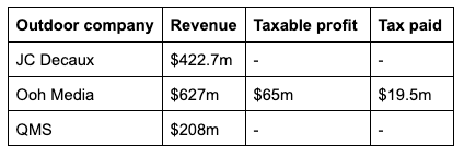 We rarely see how outdoor players JC Decaux and QMS are travelling - JC Decaux is owned out of France and QMS is privately held by Quadrant Private Equity.