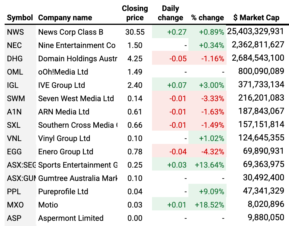 Sports Entertainment Group, owner of radio network SEN, rose by 13.6% to a $70m market cap. And Pureprofile rose 9.1% to a $47m market cap.