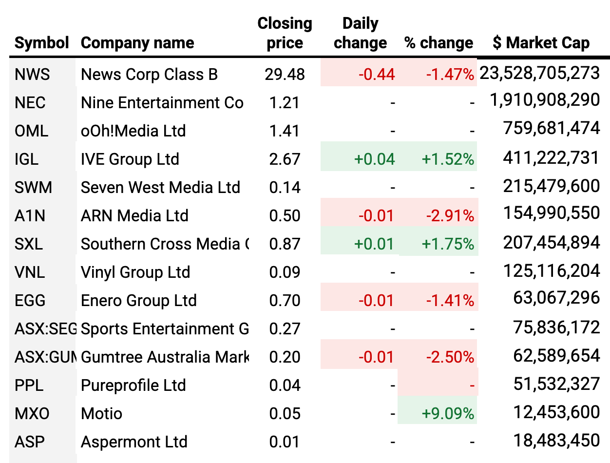 ARN Media ended the week on a downbeat note, losing 2.9% today to land on a market capitalisation of $155m. Meanwhile rival audio stock Southern Cross Austereo improved by 1.8% to close on a $207m valuation.