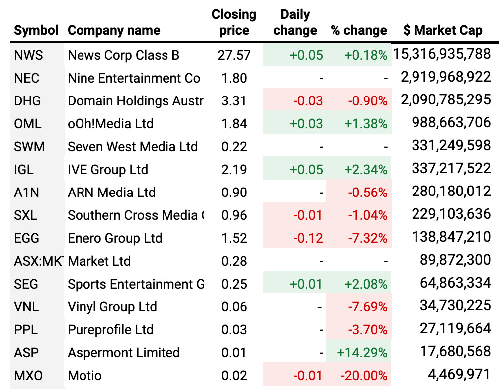 Elsewhere, Southern Cross Austereo - which reports its results this morning - lost 1.04%, and its rival (and potential buyer) ARN Media lost 0.56%.